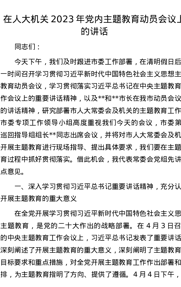 在人大机关2023年党内主题教育动员会议上的讲话