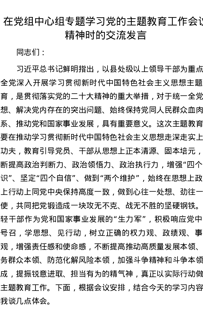 在党组中心组专题学习党的主题教育工作会议精神时的交流发言