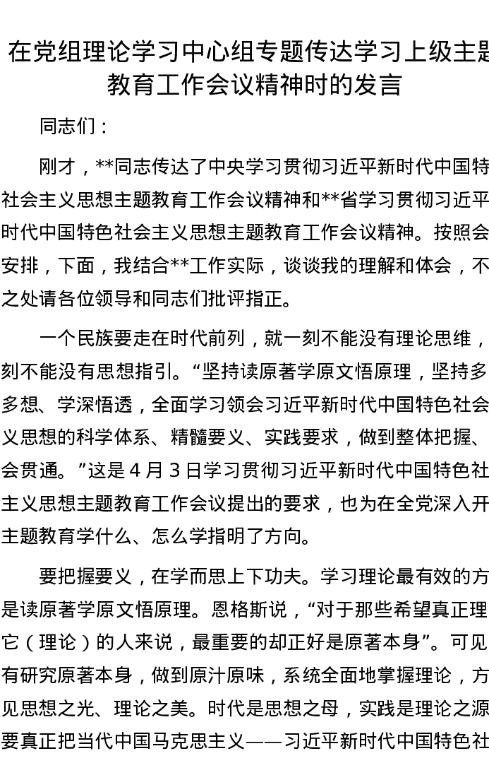 在党组理论学习中心组专题传达学习上级主题教育工作会议精神时的发言