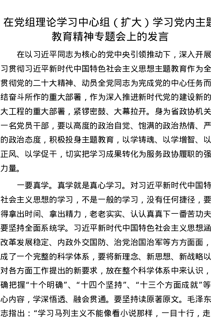 在党组理论学习中心组(扩大)学习党内主题教育精神专题会上的发言