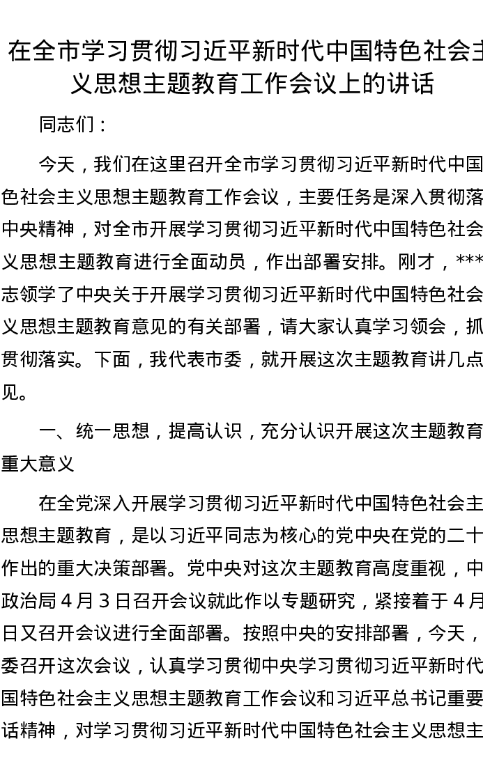 在全市学习贯彻习近平新时代中国特色社会主义思想主题教育工作会议上的讲话