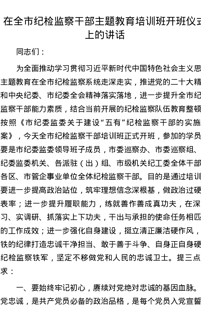 在全市纪检监察干部主题教育培训班开班仪式上的讲话