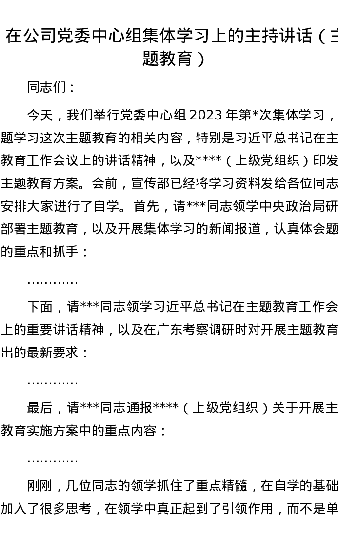 在公司党委中心组集体学习上的主持讲话(主题教育)