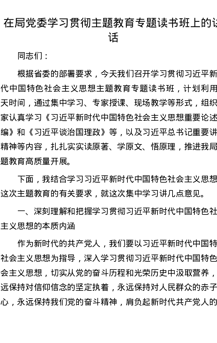 在局党委学习贯彻主题教育专题读书班上的讲话