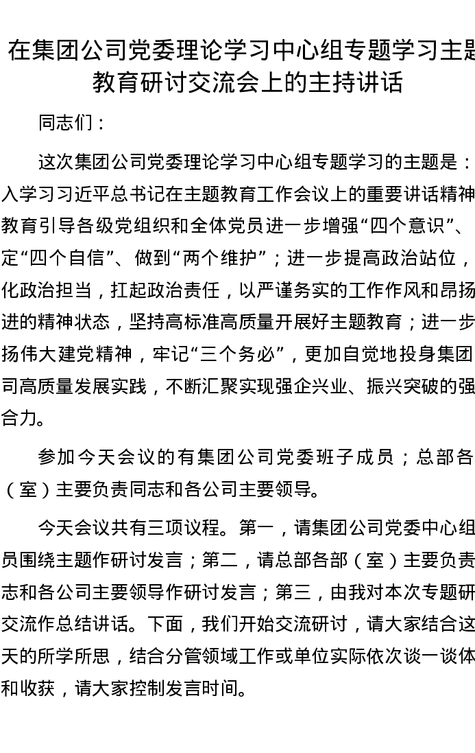 在集团公司党委理论学习中心组专题学习主题教育研讨交流会上的主持讲话