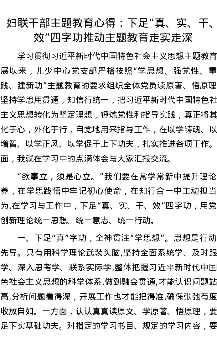 妇联干部主题教育心得:下足“真、实、干、效”四字功 推动主题教育走实走深