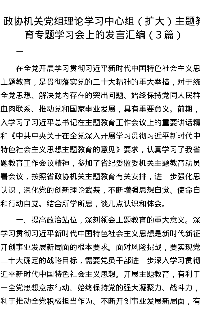 政协机关党组理论学习中心组(扩大)主题教育专题学习会上的发言汇编(3篇)