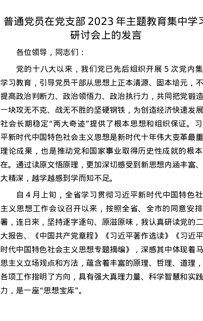 普通党员在党支部2023年主题教育集中学习研讨会上的发言