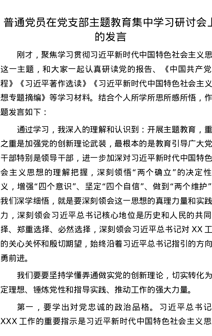 普通党员在党支部主题教育集中学习研讨会上的发言
