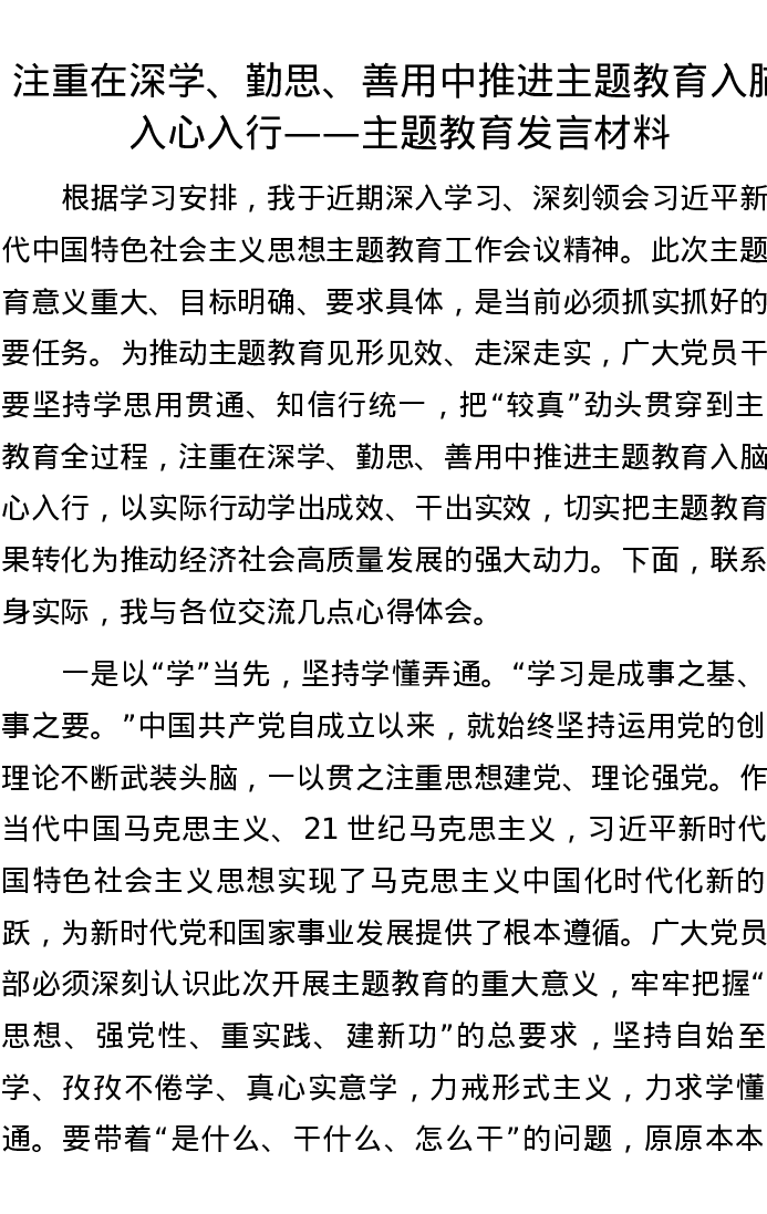 注重在深学、勤思、善用中推进主题教育入脑入心入行——主题教育发言材料