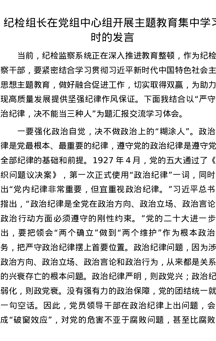 纪检组长在党组中心组开展主题教育集中学习时的发言