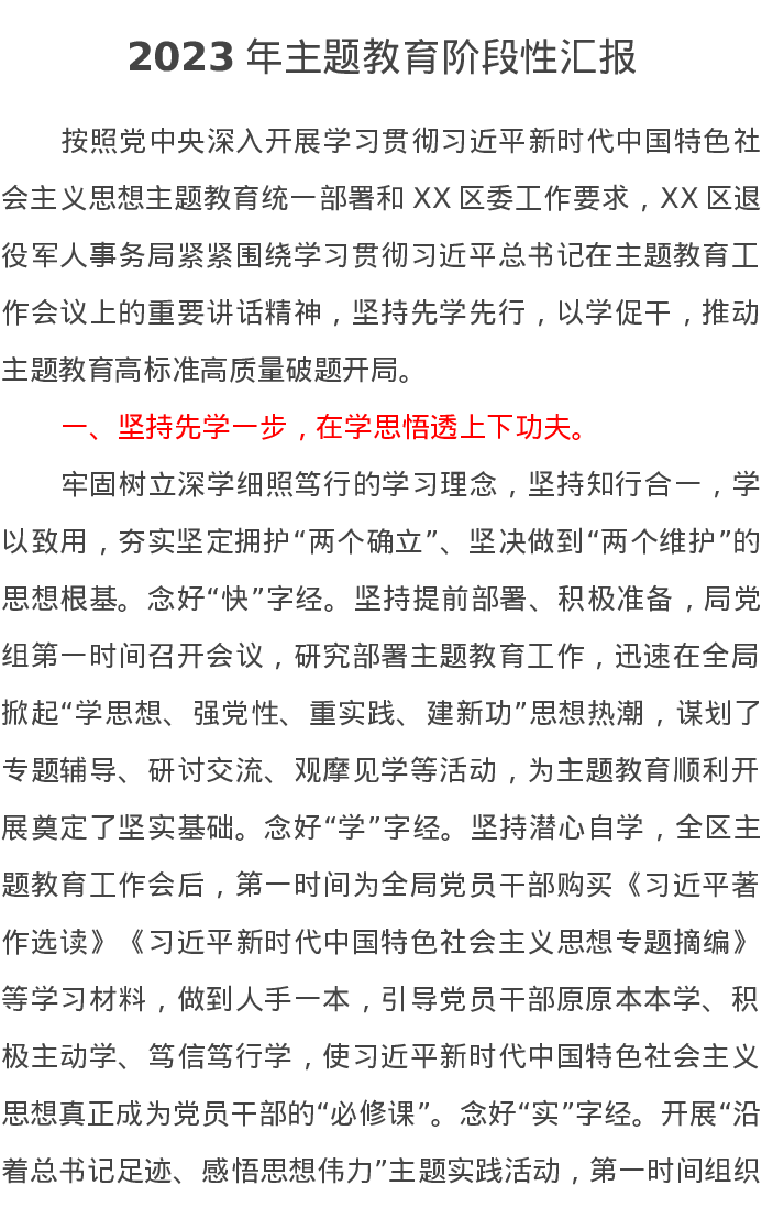 2023年主题教育阶段性汇报(特色社会主义思想)