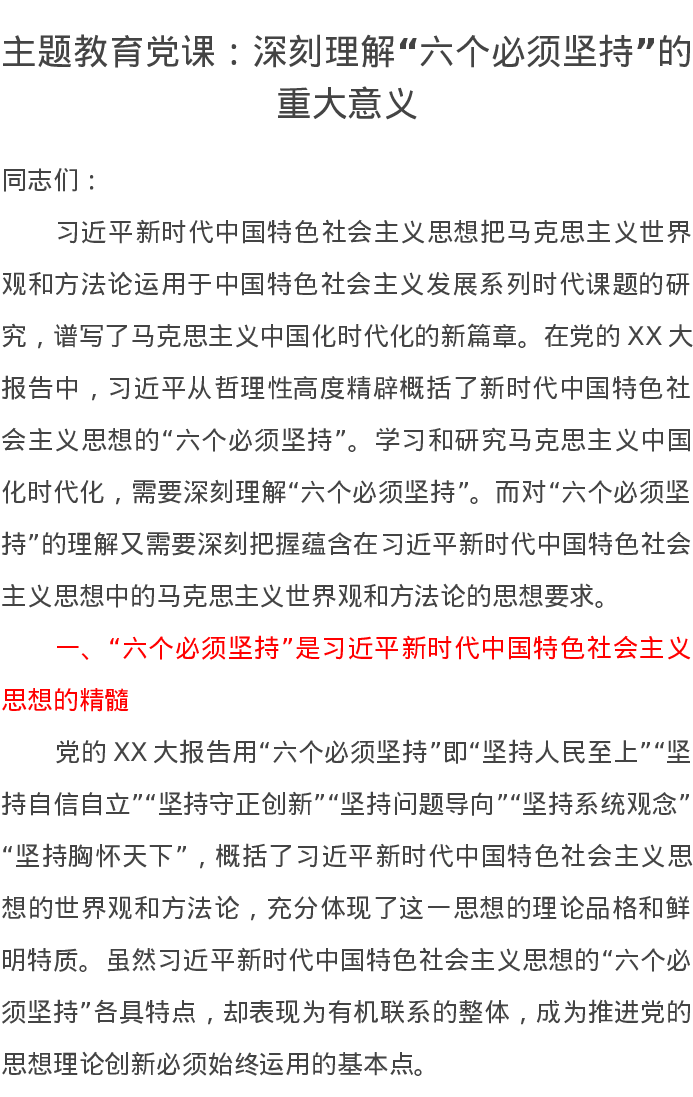 主题教育党课:深刻理解“六个必须坚持”的重大意义(特色社会主义思想)