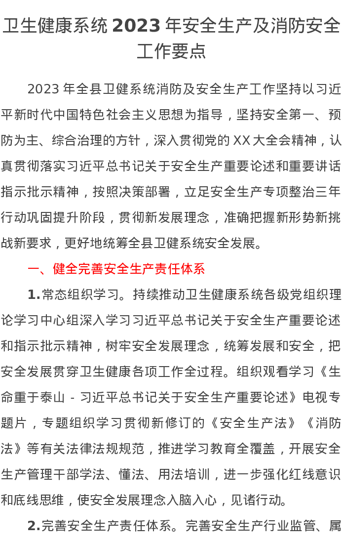 卫生健康系统2023年安全生产及消防安全工作要点