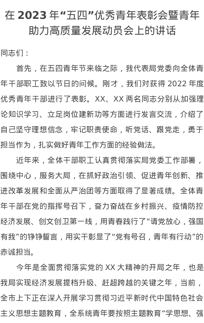 在2023年“五四”优秀青年表彰会暨青年助力高质量发展动员会上的讲话