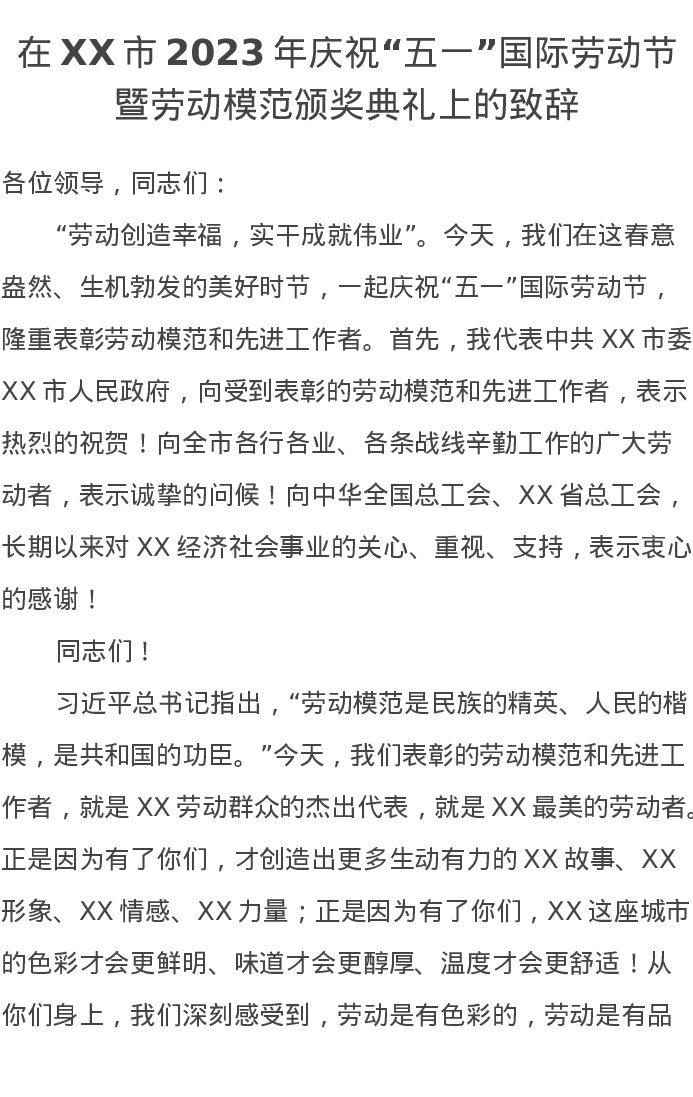 在XX市2023年庆祝“五一”国际劳动节暨劳动模范颁奖典礼上的致辞