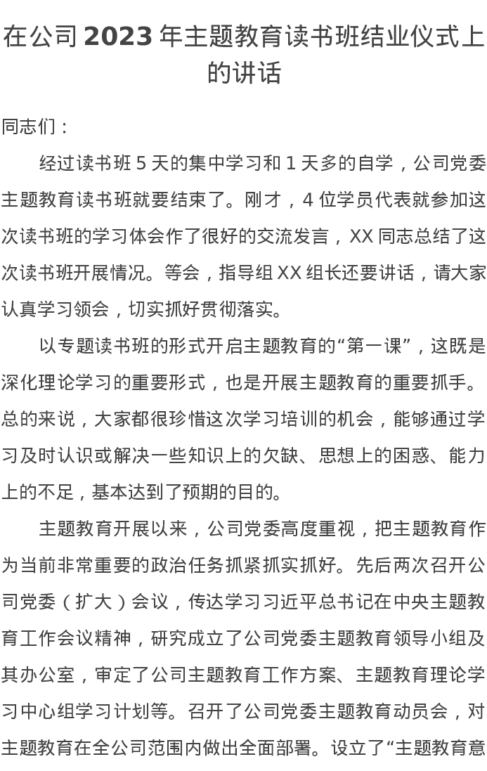 在公司2023年主题教育读书班结业仪式上的讲话(特色社会主义思想)