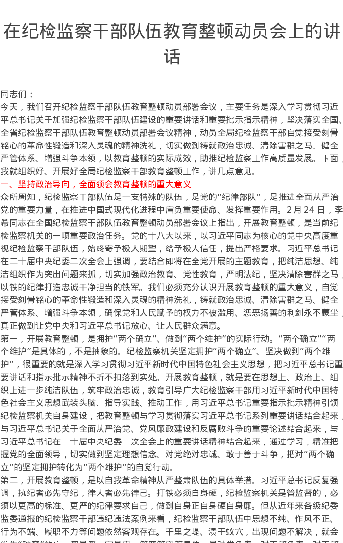 在纪检监察干部队伍教育整顿动员会上的讲话