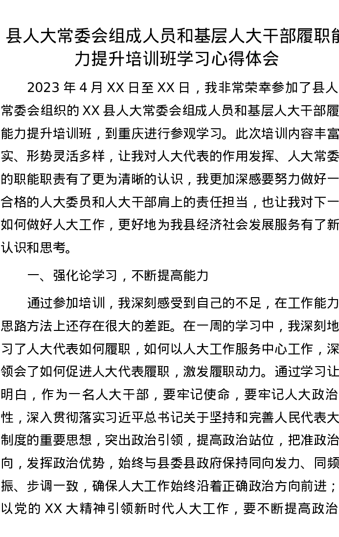 县人大常委会组成人员和基层人大干部履职能力提升培训班学习心得体会