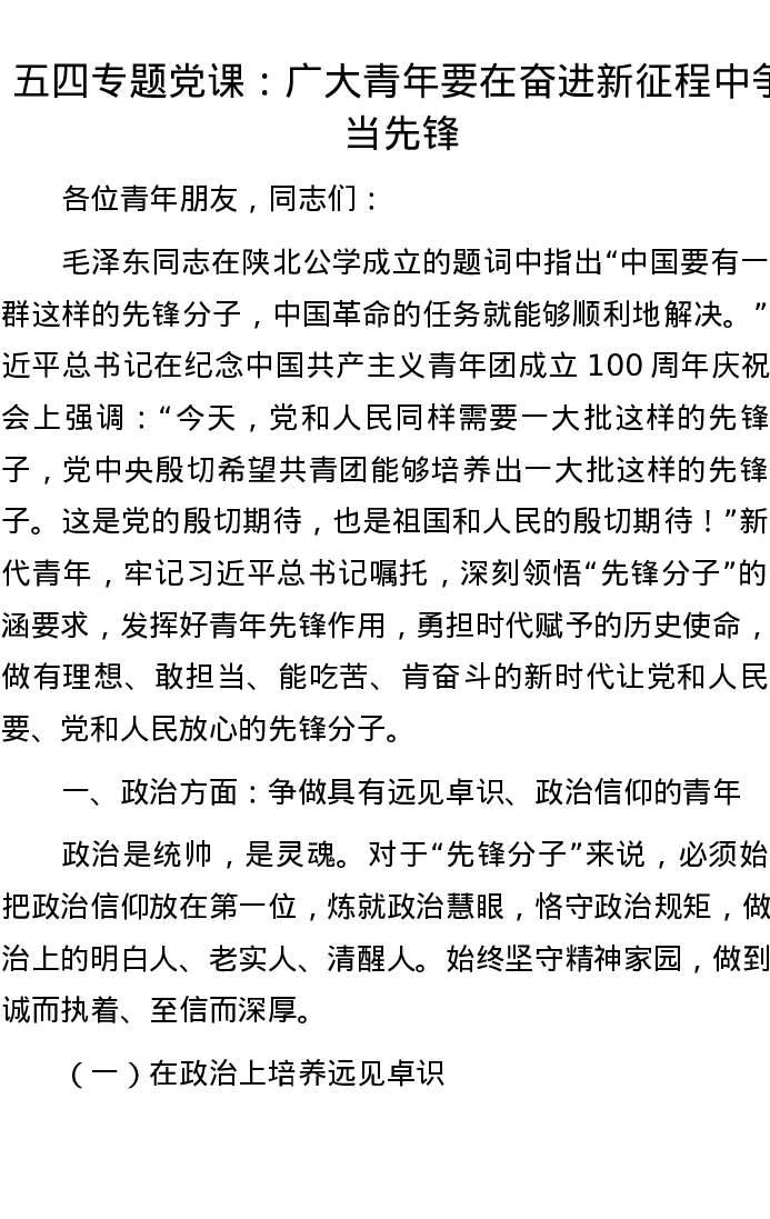 五四专题党课:广大青年要在奋进新征程中争当先锋