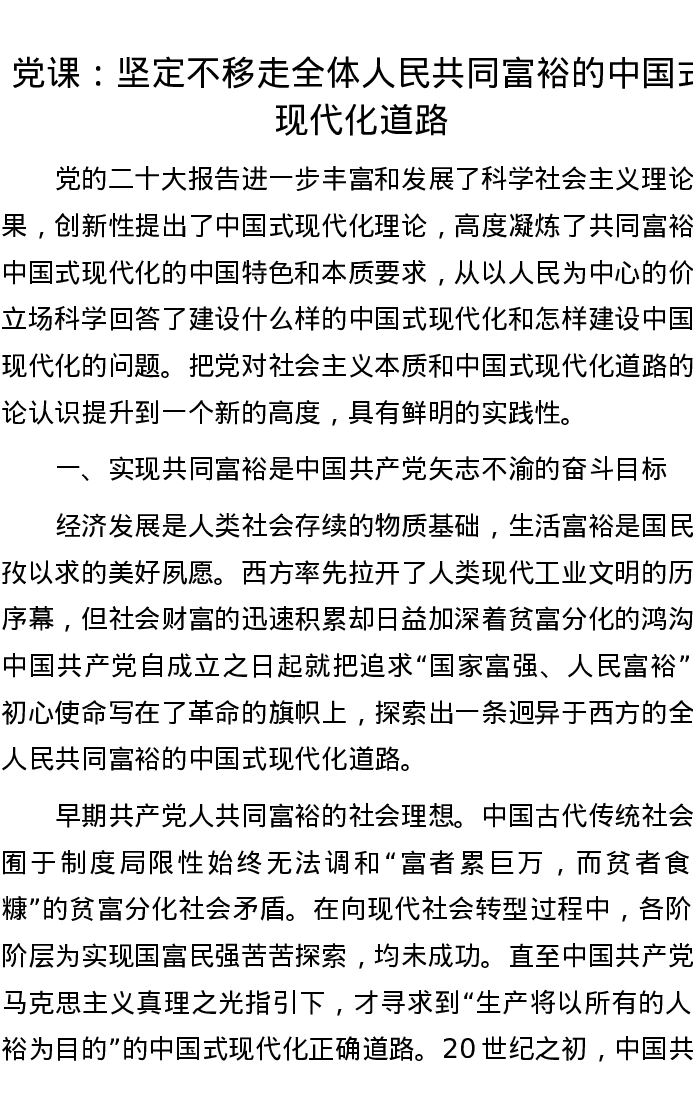 党课:坚定不移走全体人民共同富裕的中国式现代化道路