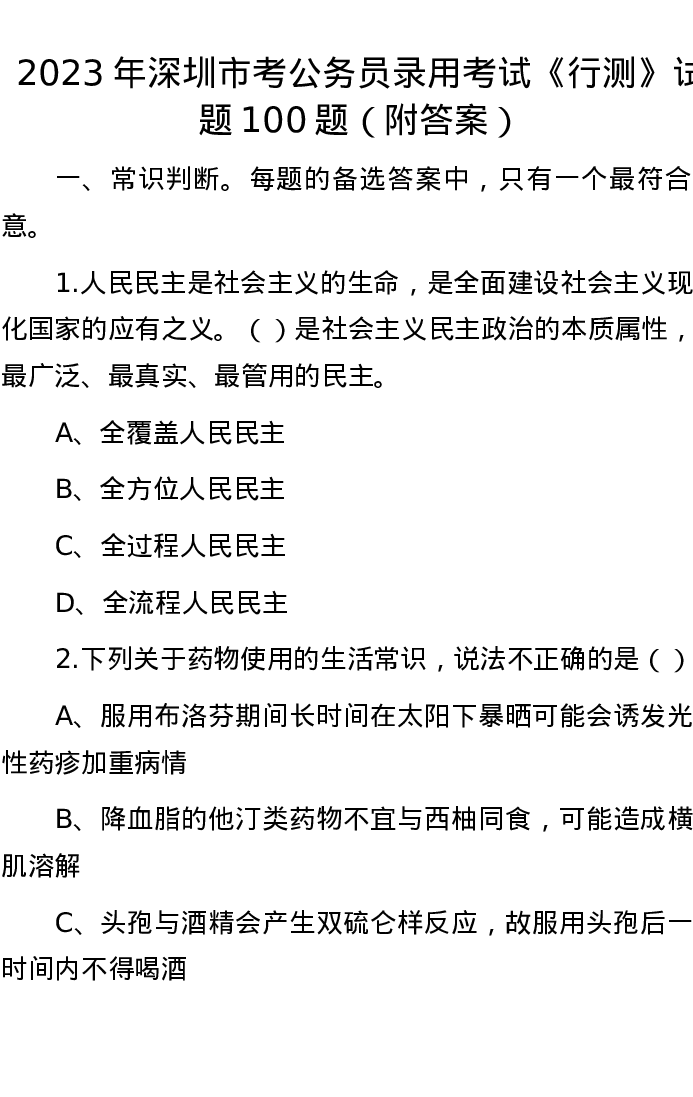 2023年深圳市考公务员录用考试《行测》试题100题(附答案)