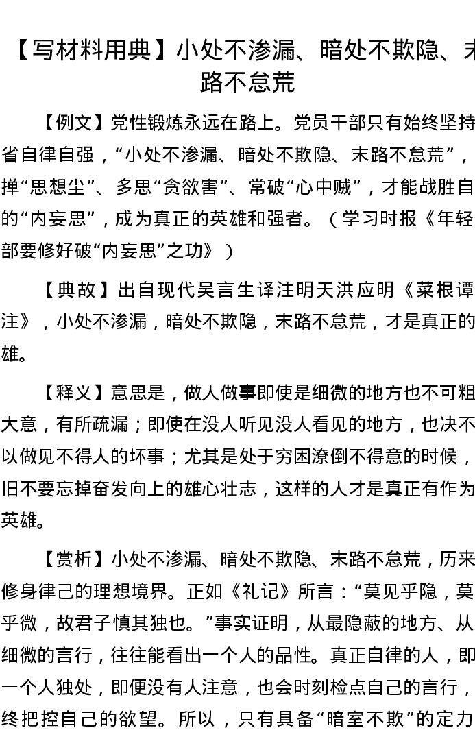 【写材料用典】小处不渗漏、暗处不欺隐、末路不怠荒