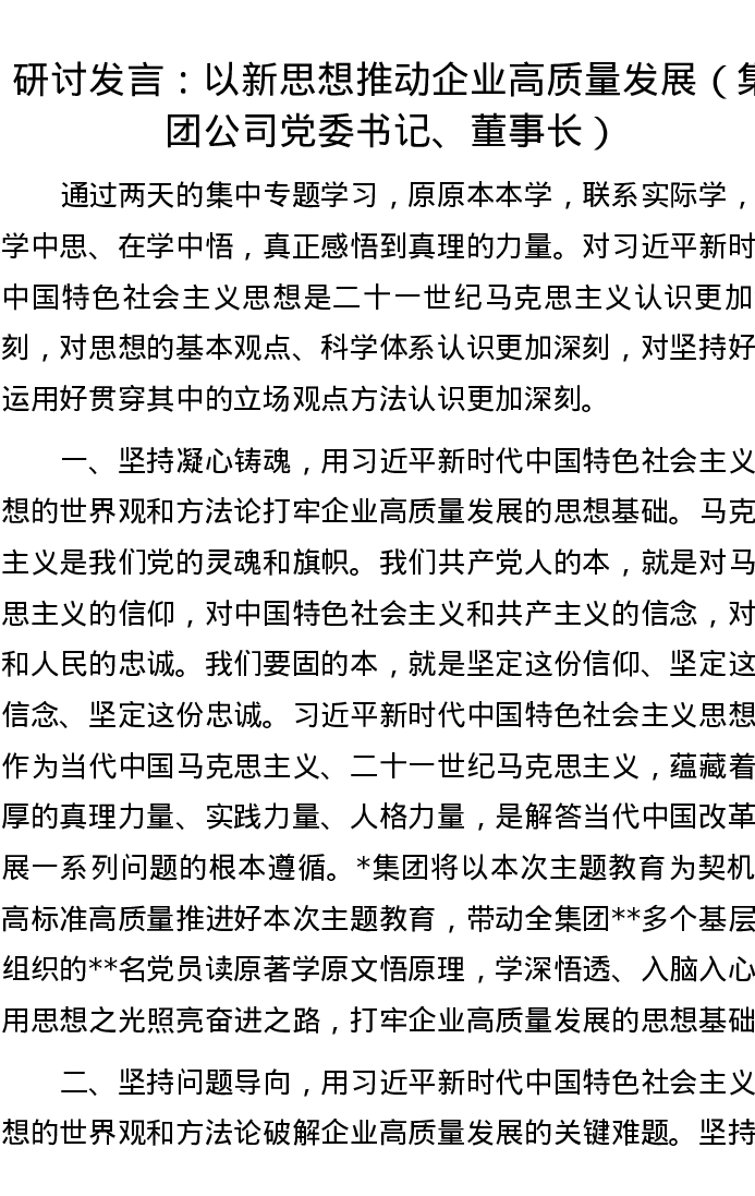 研讨发言:以新思想推动企业高质量发展(集团公司党委书记、董事长)