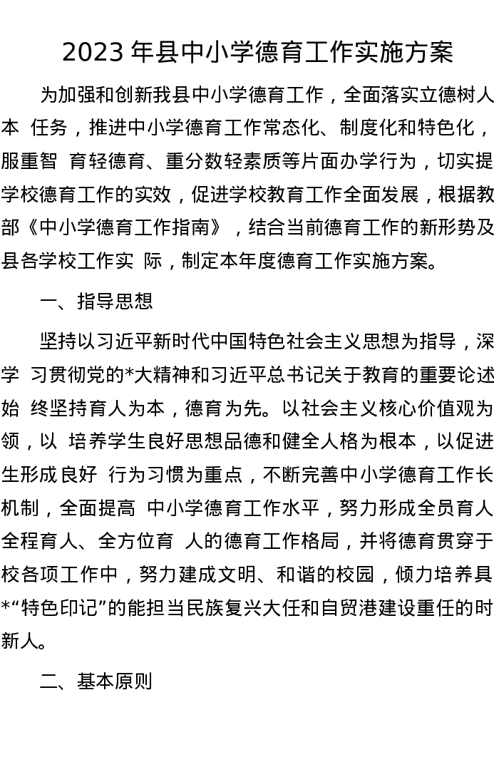 2023年县中小学德育工作实施方案