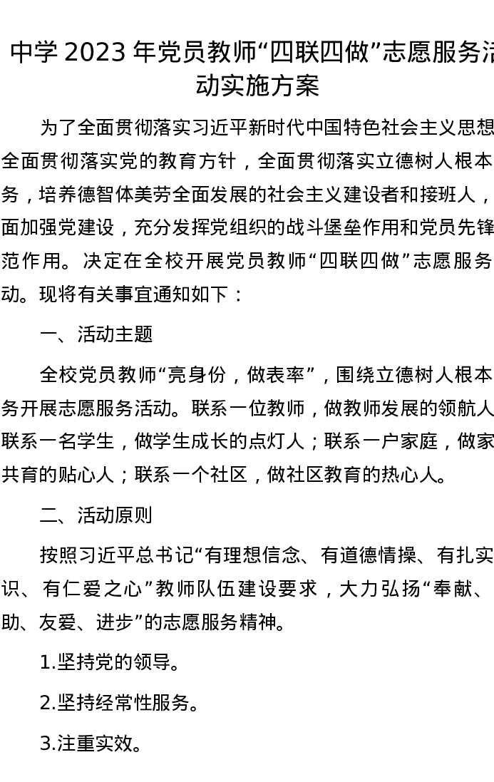 中学2023年党员教师“四联四做”志愿服务活动实施方案