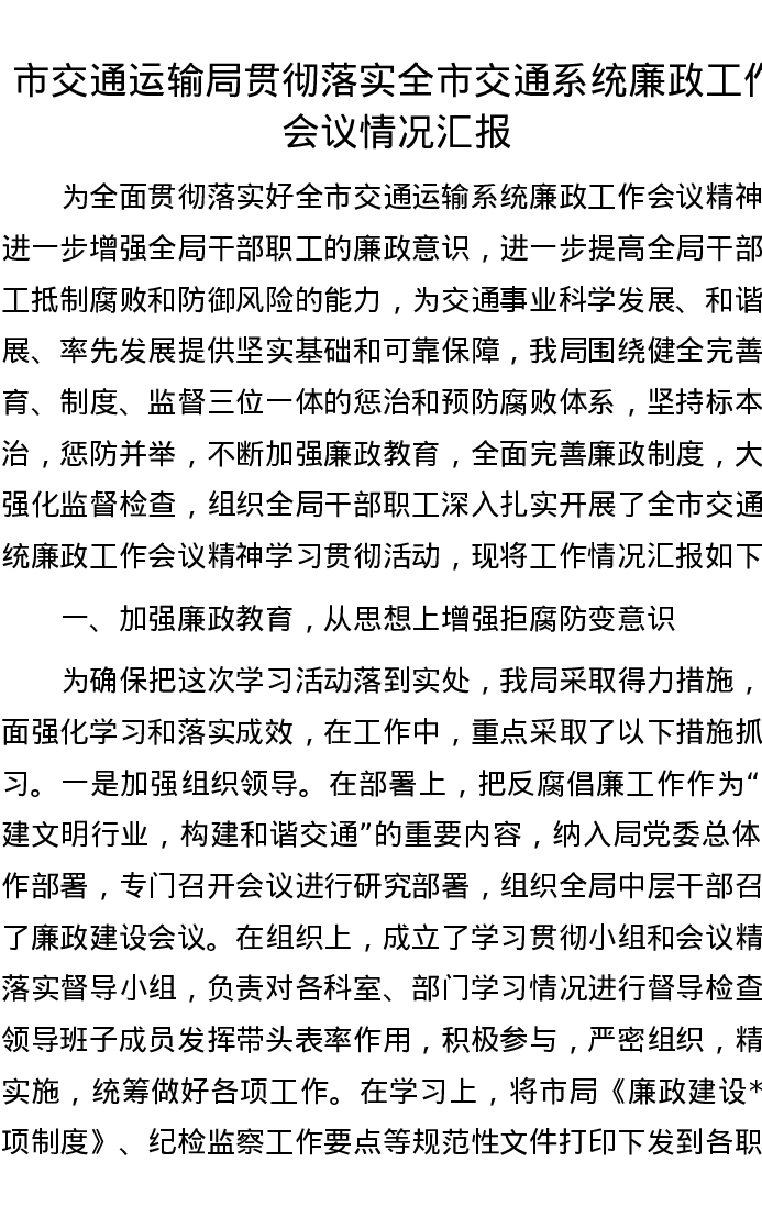 市交通运输局贯彻落实全市交通系统廉政工作会议情况汇报