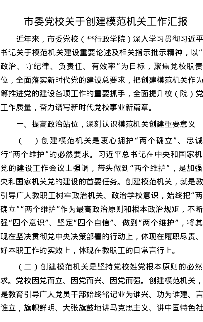 市委党校关于创建模范机关工作汇报