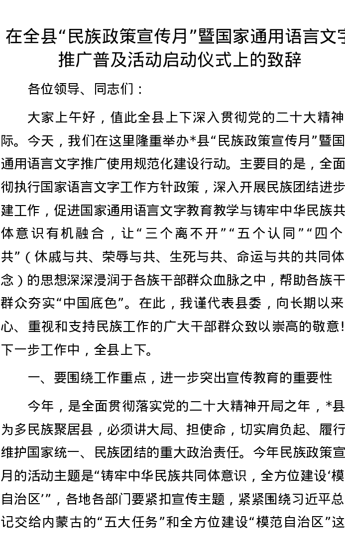 在全县“民族政策宣传月”暨国家通用语言文字推广普及活动启动仪式上的致辞