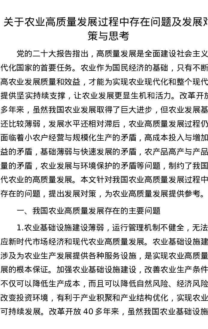 关于农业高质量发展过程中存在问题及发展对策与思考