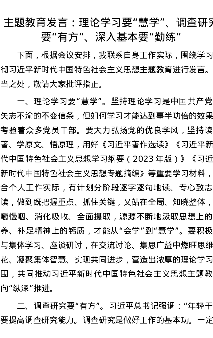 主题教育发言:理论学习要“慧学”、调查研究要“有方”、深入基本要“勤练”