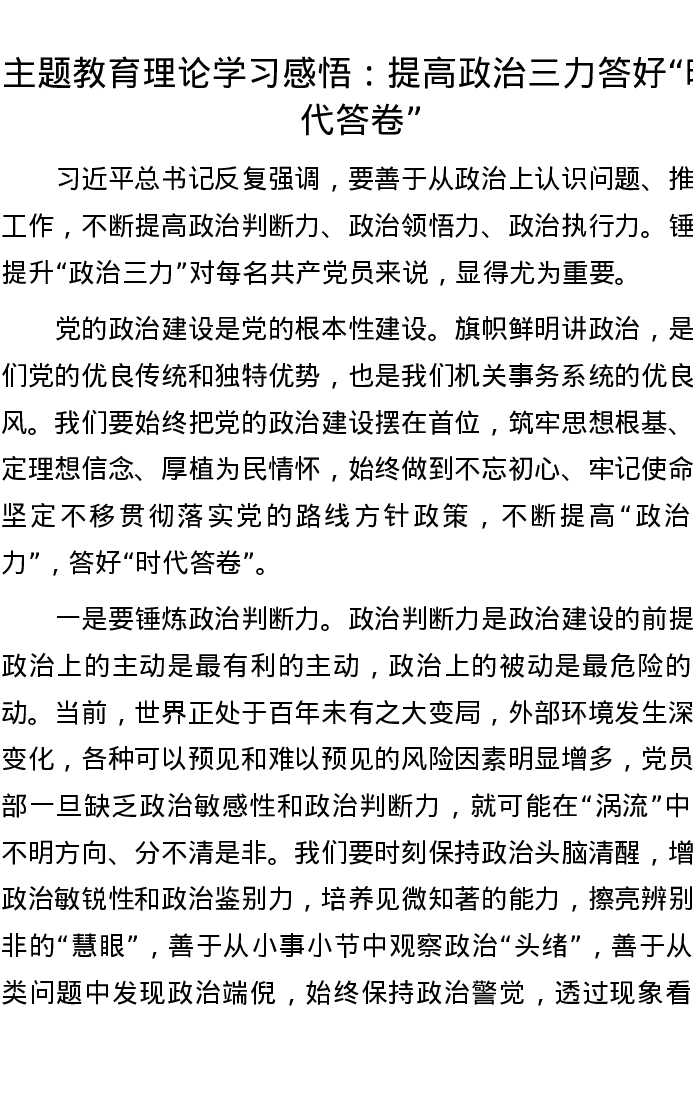 主题教育理论学习感悟:提高政治三力 答好“时代答卷”