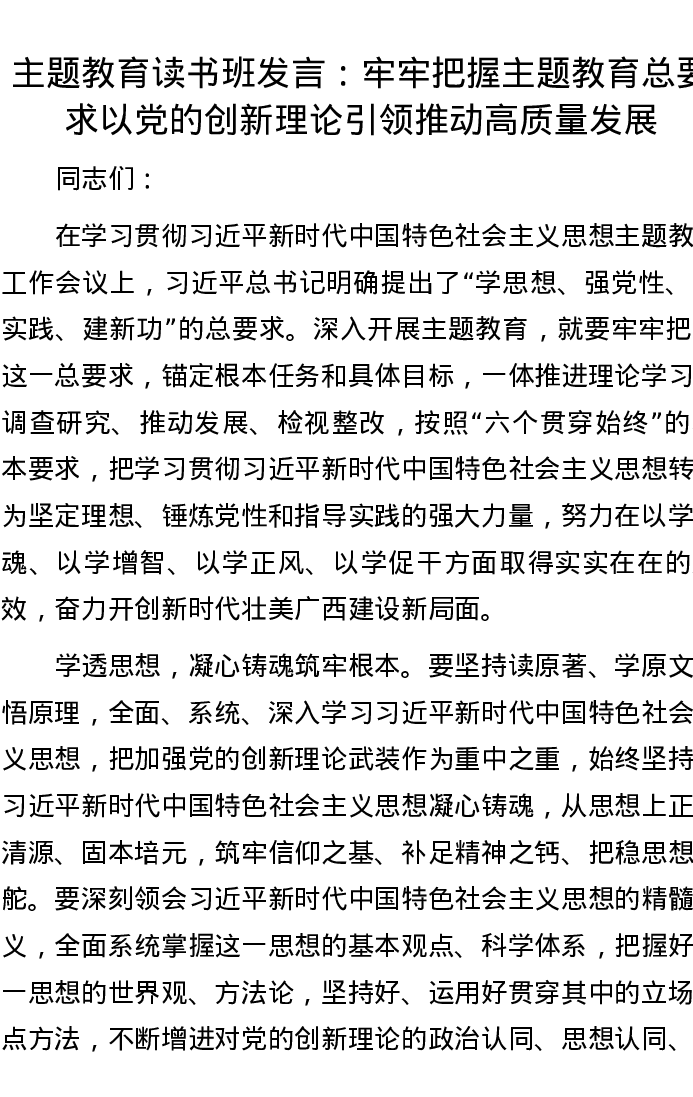 主题教育读书班发言:牢牢把握主题教育总要求 以党的创新理论引领推动高质量发展