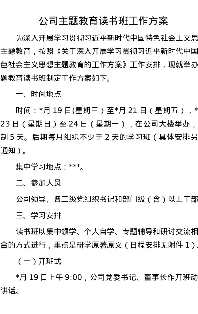 公司主题教育读书班工作方案