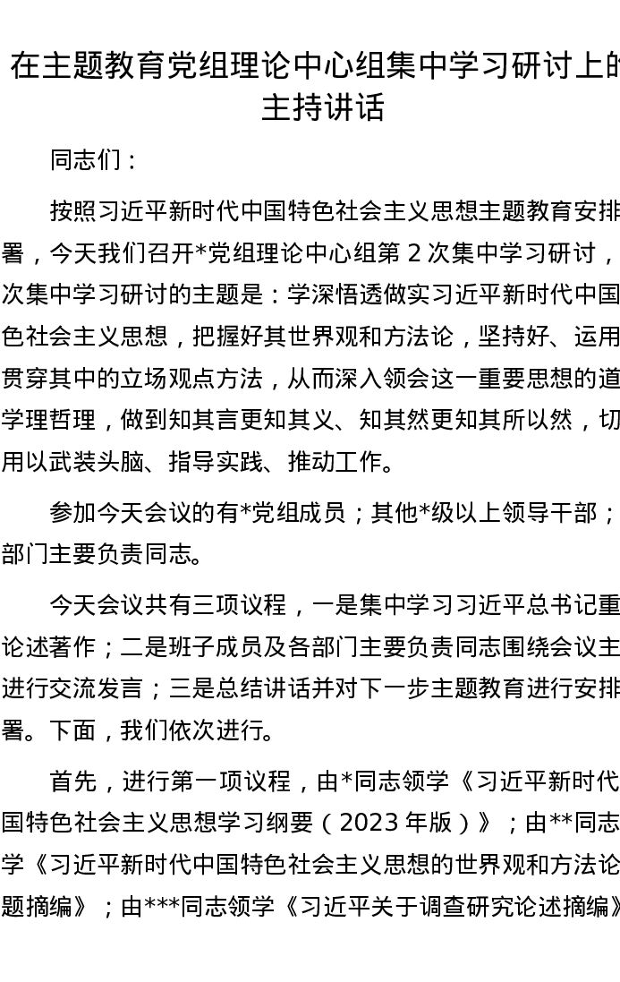 在主题教育党组理论中心组集中学习研讨上的主持讲话