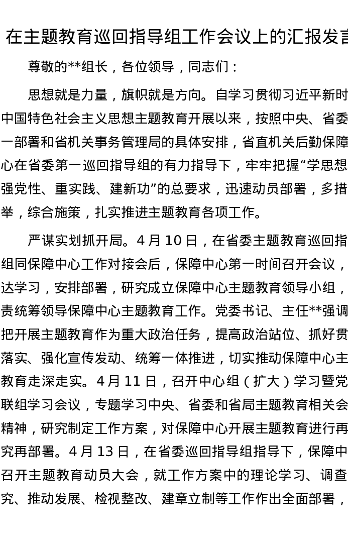 在主题教育巡回指导组工作会议上的汇报发言