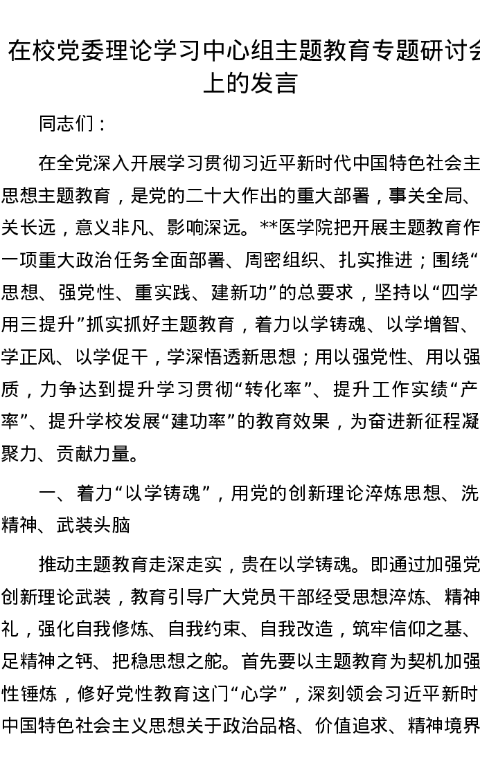 在校党委理论学习中心组主题教育专题研讨会上的发言