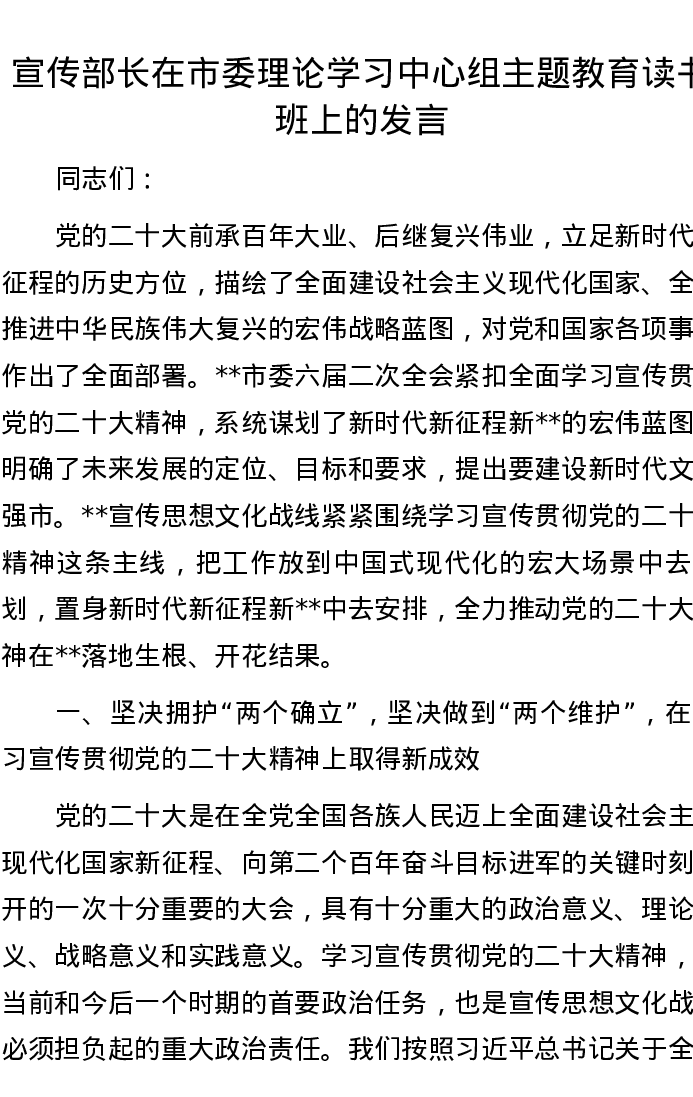 宣传部长在市委理论学习中心组主题教育读书班上的发言