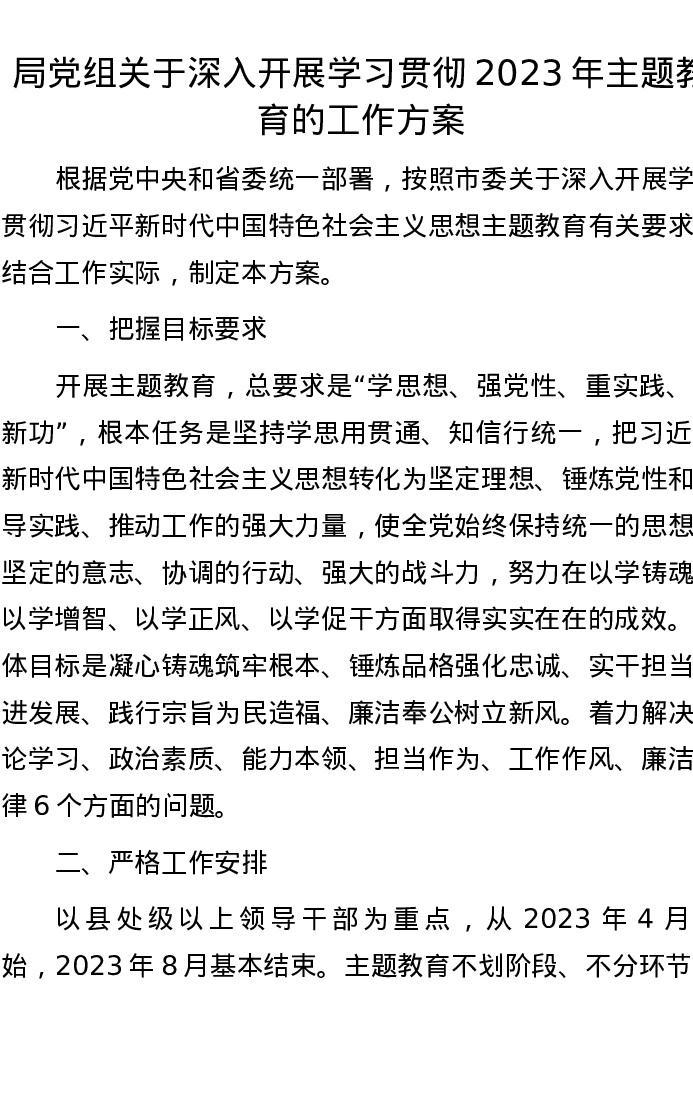 局党组关于深入开展学习贯彻2023年主题教育的工作方案