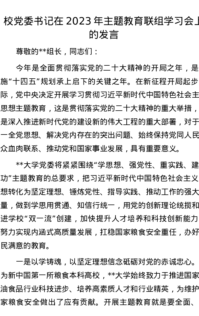 校党委书记在2023年主题教育联组学习会上的发言