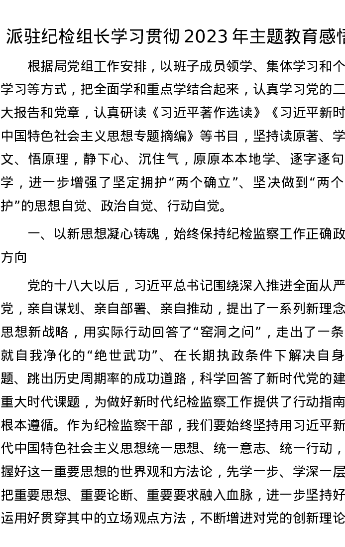 派驻纪检组长学习贯彻2023年主题教育感悟