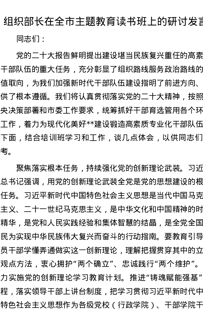 组织部长在全市主题教育读书班上的研讨发言