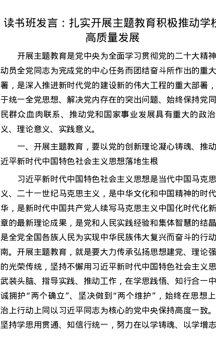 读书班发言:扎实开展主题教育 积极推动学校高质量发展