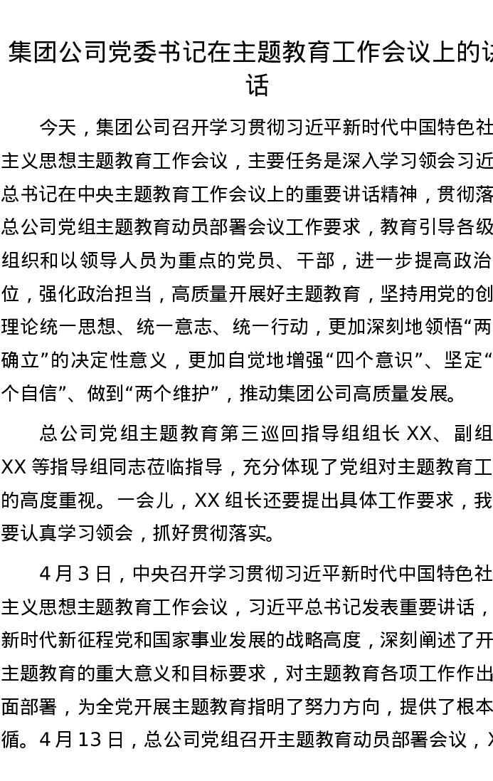 集团公司党委书记在主题教育工作会议上的讲话
