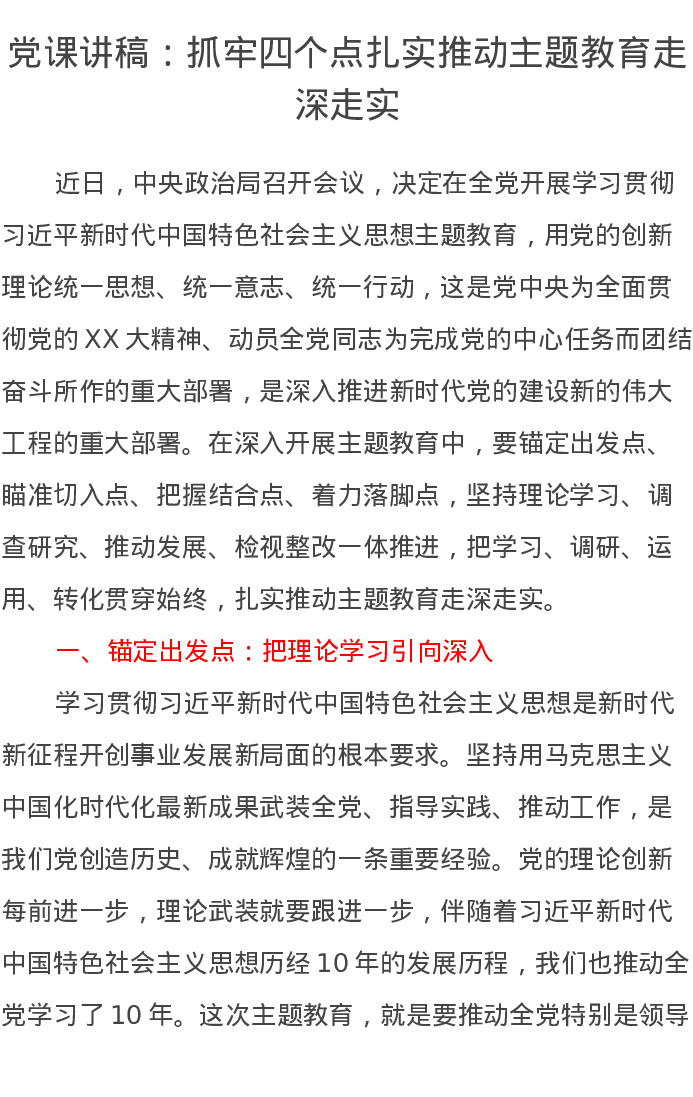 党课讲稿:抓牢四个点扎实推动主题教育走深走实(特色社会主义思想)