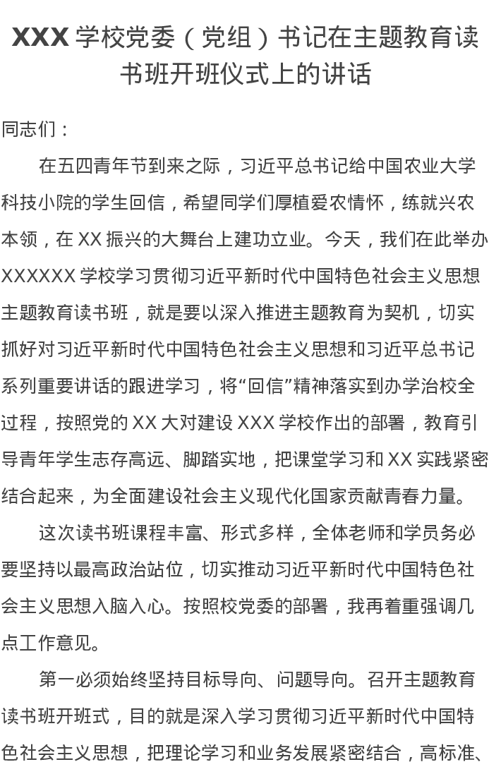 XXX学校党委(党组)书记在主题教育读书班开班仪式上的讲话(特色社会主义思想)